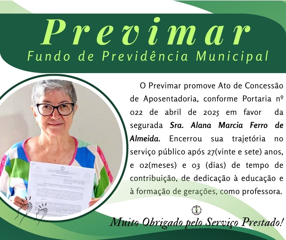 O Previmar promove ato de concessão de aposentadoria, conforme Portaria nº022 de abril de 2025 para a segurada Srª Alana Marcia Ferro de Almeida. Encerrou sua trajetória no serviço público após 27 anos, 02 meses e 03 dias de tempo de contribuição de dedicacão à educação e à formação de gerações, como professora.