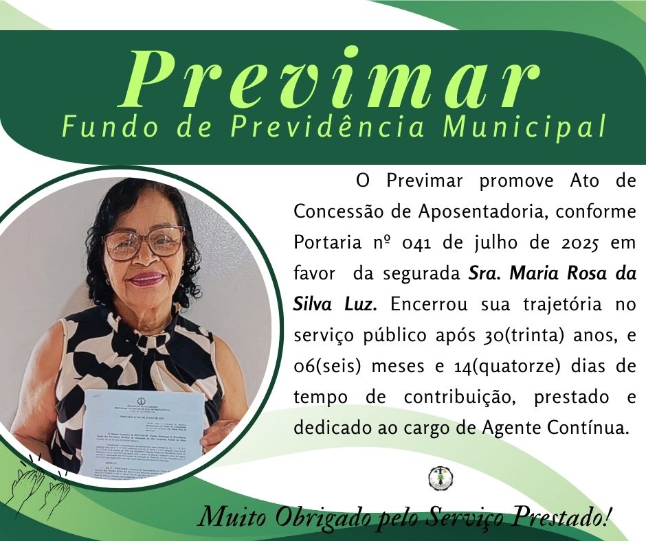 O Previmar promove ato de Concessão de Aposentadoria, conforme Portaria nº41 de julho 2025 para a segurada Sraº Maria Rosa da Silva Luz. Encerrou sua trajetória no serviço público após 30 anos, 06 meses e 14 dias de tempo de contribuição e dedicação ao cargo de Contínua.