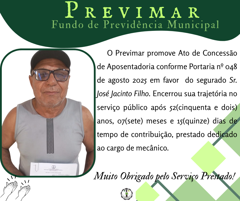 O Previmar promove Ato de Concessão de Aposentadoria conforme Portaria nº 048 de agosto de 2025 em favor do segurado Sr. José Jacinto Filho.