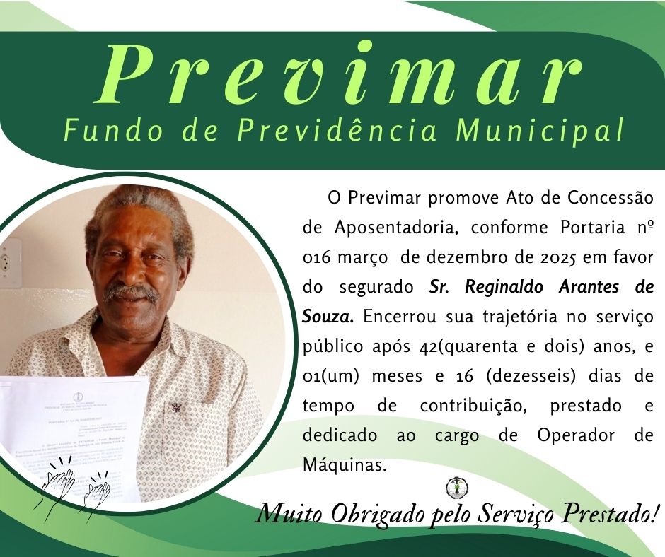 O Previmar dispõe sobre a concessão do benefício Aposentadoria por Tempo de Contribuição, onde o Sr. Reginaldo Arantes de Souza, desempenhou suas atividades laborais por 42 anos e 01 mês e 08 dias, equivalente a 15.378 dias líquido, em favor do Município de Alto Araguaia - MT.