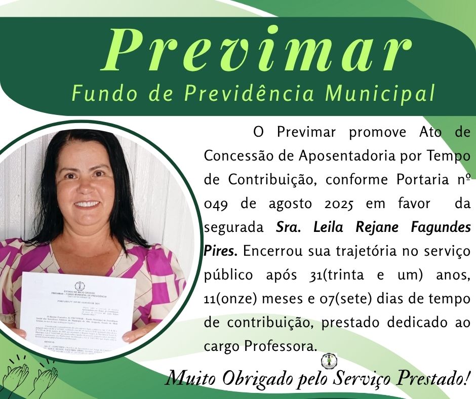O Previmar promove Ato de Concessão de Aposentadoria por Tempo de Contribuição, conforme Portaria nº 049 de agosto 2025 em favor da segurada Sra. Leila Rejane Fagundes Pires. Encerrou sua trajetória no serviço público após 31(trinta e um) anos, 11(onze) meses e 07(sete) dias de tempo de contribuição, prestado dedicado ao cargo de Professora.